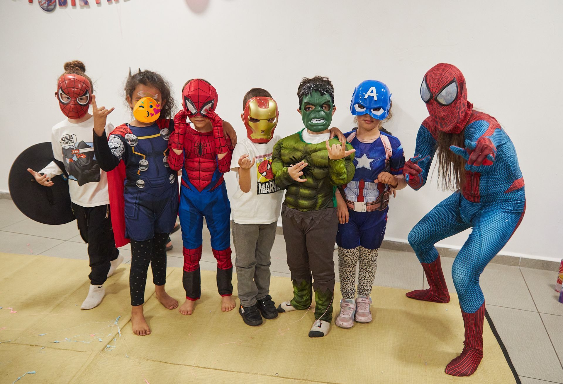 הילדים נכנסים לעולם של גיבורי העל עם סיפורו של ספיידרמן. החגיגה כוללת תפאורה ואביזרים שהופכים את הסיפור למציאותי ומרתק.